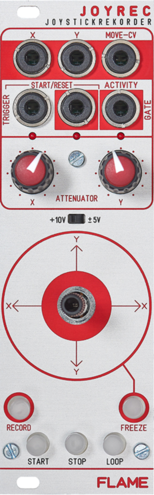 2-axis Joystick - Stepsequencer - Dual CV source The Flame "MEMORY JOYSTICK module is a small programmable joystick, designed for small mobile euro racks. With the Memory Joystick, you can control your modular system like an old video game console. Short movements of the stick are recordable (max. ca. 3sec). Eight positions can be stored and recalled via buttons. Alternatively, it is possible to jump from one to the next value. The feel then is similar to a step sequencer. You can even vary the playback behaviour. The Memory Joystick can generate unipolar or bipolar voltages in the range of 2 V, 5 V or 10 V. more informations, manuals, downloads here |
