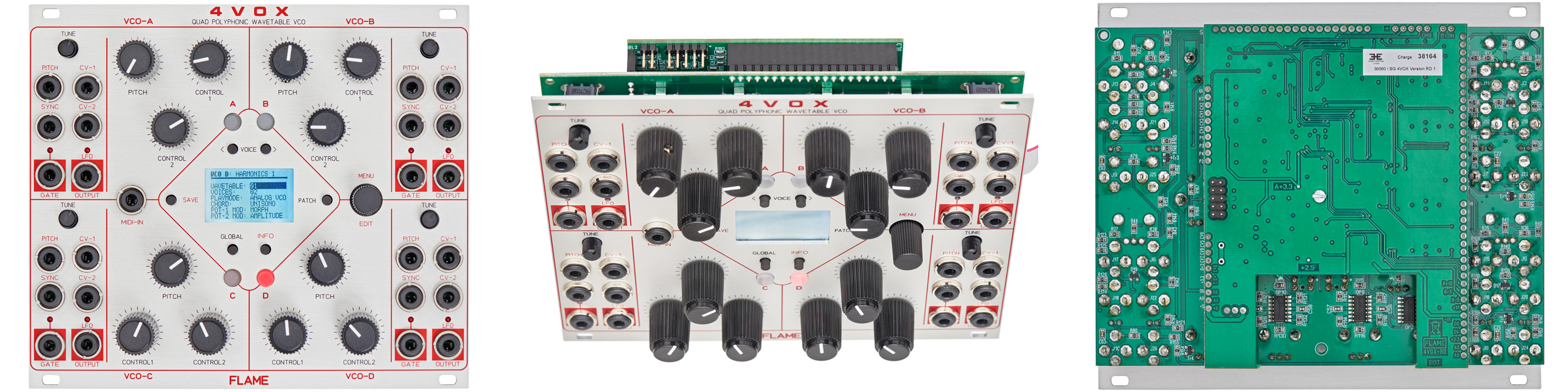 Quad wavetable oscillator - Quad LFO - MIDI wavetable expander The 4VOX is a quad wavetable oscillator with up to four voices per VCO channel, resulting in a maximum of 16 voices at four individual outputs. Due to a MIDI input the module can be played both with CVs or/and directly via MIDI - MIDI allows for modulating some additional parameters. There are 39 memory locations for wavetables and 32 patches for all global and VCO parameters. The parameters of a wavetable can be controlled by CVs and by MIDI. For instance you can morph through a wavetable with a CV, a MIDI controller or manually with the potentiometer. The range of waves within a wavetable can be selected by minimum and maximum values individually per voice which allows for creating more complex morphs. Further controllable parameters are Detune, Semitone, Octave, Chord, Portamento, Amplitude and Amp Move (90 degrees phase shifted volume modulation of a VCO's 4 voices). Min and max values can be selected for those parameters as well. Via MIDI it's possible to control further parameters (notes, chords, pitch bend, patch selection and wavetable selection) The VCOs can be played analog (frequency by Pitch CV input), monophonic via MIDI or 4-voice polyphonic via MIDI. The VCO can be used as a voltage controllable LFO with 3 modes: LOOP, ONE SHOT and GATED. The SYNC input is used to trigger/reset the LFO. In ONE SHOT mode the LFO can be used as a trigger delay, too (SYNC = trigger in, GATE = trigger output, PITCH = delay time). Each VCO has an analog 1V/octave input including a fine tune control (+/-1 semitone) and pitch control (approx. 10 octaves), two freely assignable CV inputs, two freely assignable potentiometers, a trigger input for Sync/LFO-reset as well as a Gate and VCO/LFO output All global parameters and also the VCO's setings can be named and saved as a non-volatile patch by the user (32 patch memory locations are available). The display can show a graphic of the selected waveforms. Software/wavetable updates are easy possible via MIDI sysex dump. more informations, manuals, downloads here |